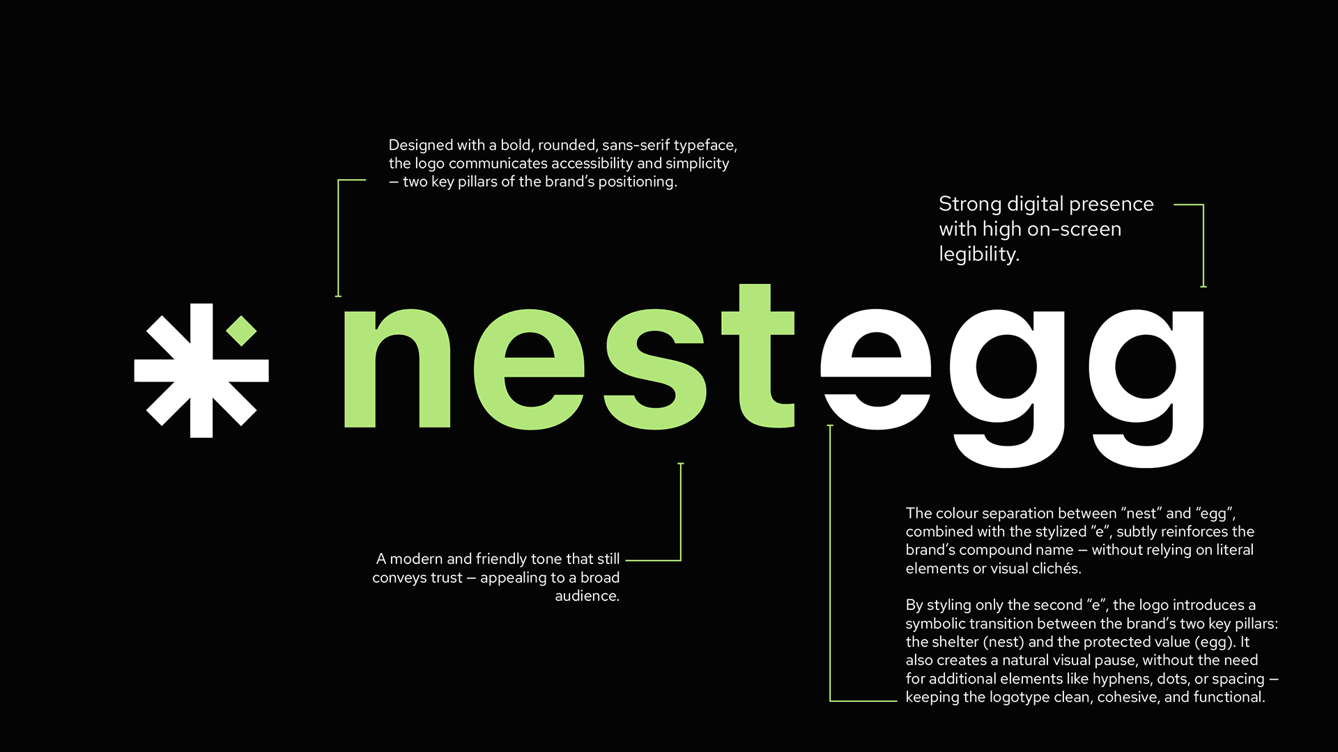 A separação de cores entre “nest” e “egg”, combinada com o “e” estilizado, reforça sutilmente o nome composto da marca — sem recorrer a elementos literais ou clichês visuais. Ao estilizar apenas o segundo “e”, o logotipo introduz uma transição simbólica entre os dois pilares centrais da marca: o abrigo (nest) e o valor protegido (egg). Isso cria uma pausa visual natural, sem necessidade de elementos adicionais como hífens, pontos ou espaçamentos — mantendo o logotipo limpo, coeso e funcional.