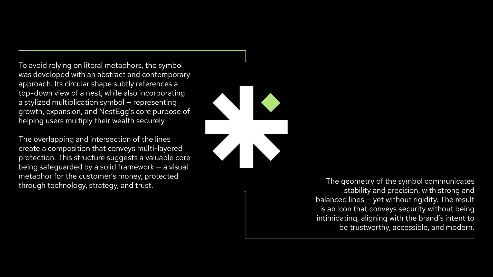 Para evitar o uso de metáforas literais, o símbolo foi desenvolvido com uma abordagem abstrata e contemporânea. Sua forma circular faz uma referência sutil a uma vista superior de um ninho, ao mesmo tempo em que incorpora um símbolo de multiplicação estilizado — representando crescimento, expansão e o propósito central da NestEgg: ajudar usuários a multiplicar seu patrimônio com segurança. A sobreposição e interseção das linhas criam uma composição que transmite a ideia de proteção em múltiplas camadas. Essa estrutura sugere um núcleo valioso sendo resguardado por uma base sólida — uma metáfora visual para o dinheiro do cliente, protegido por meio de tecnologia, estratégia e confiança. A geometria do símbolo comunica estabilidade e precisão, com linhas sólidas e equilibradas — mas sem rigidez. O resultado é um ícone que transmite segurança sem ser intimidante, alinhado à intenção da marca de ser confiável, acessível e moderna.