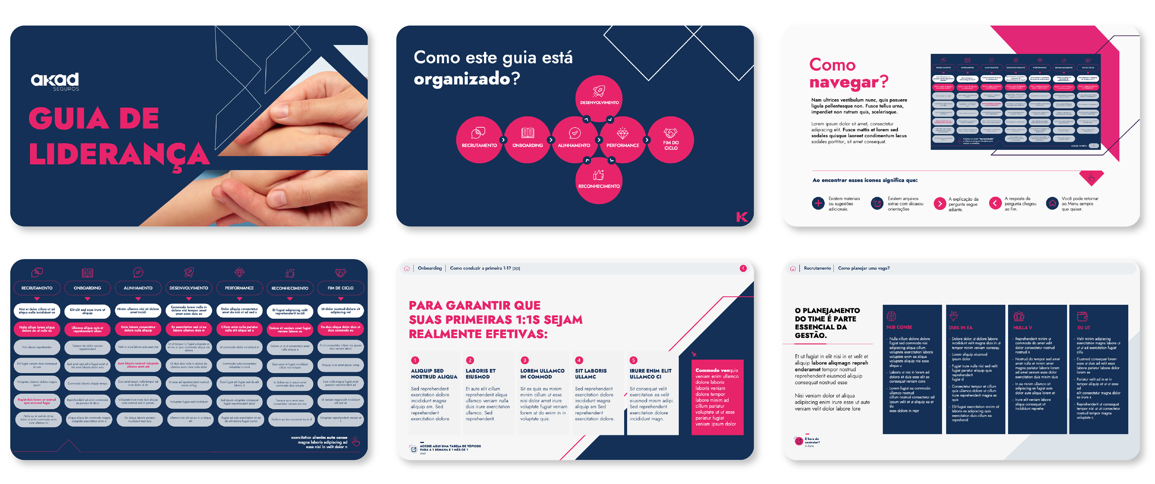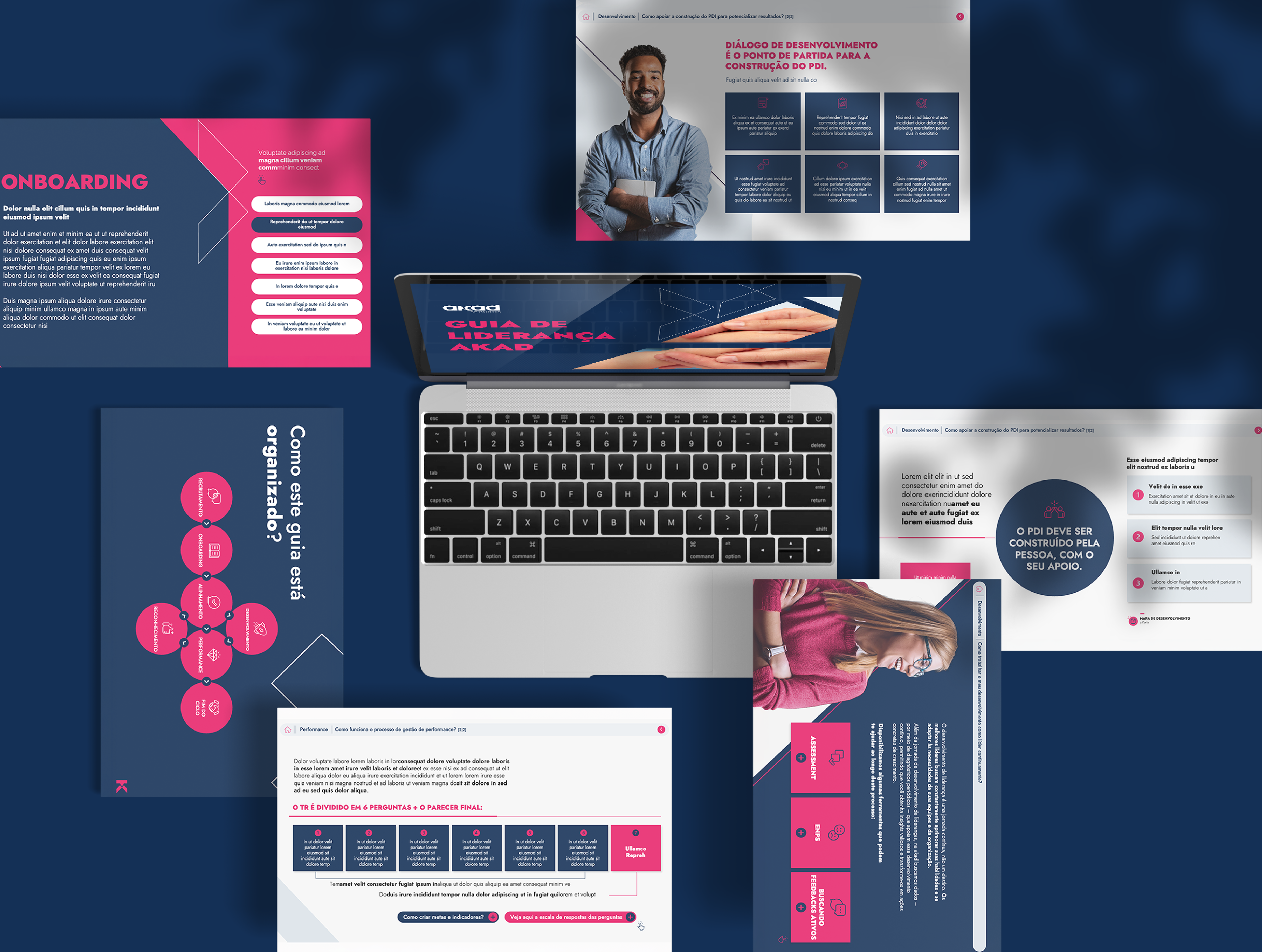Criação do layout de um e-book interativo para lideranças da Akad Seguros, seguradora brasileira com foco em soluções digitais e ágeis. O projeto partiu de um conteúdo estratégico e denso, transformado em uma experiência acessível, funcional e intuitiva, sem perder a identidade da marca. A estrutura foi pensada para garantir autonomia de edição, fluidez na navegação e clareza na leitura, utilizando cores, ícones e recursos gráficos como apoio à experiência do usuário.